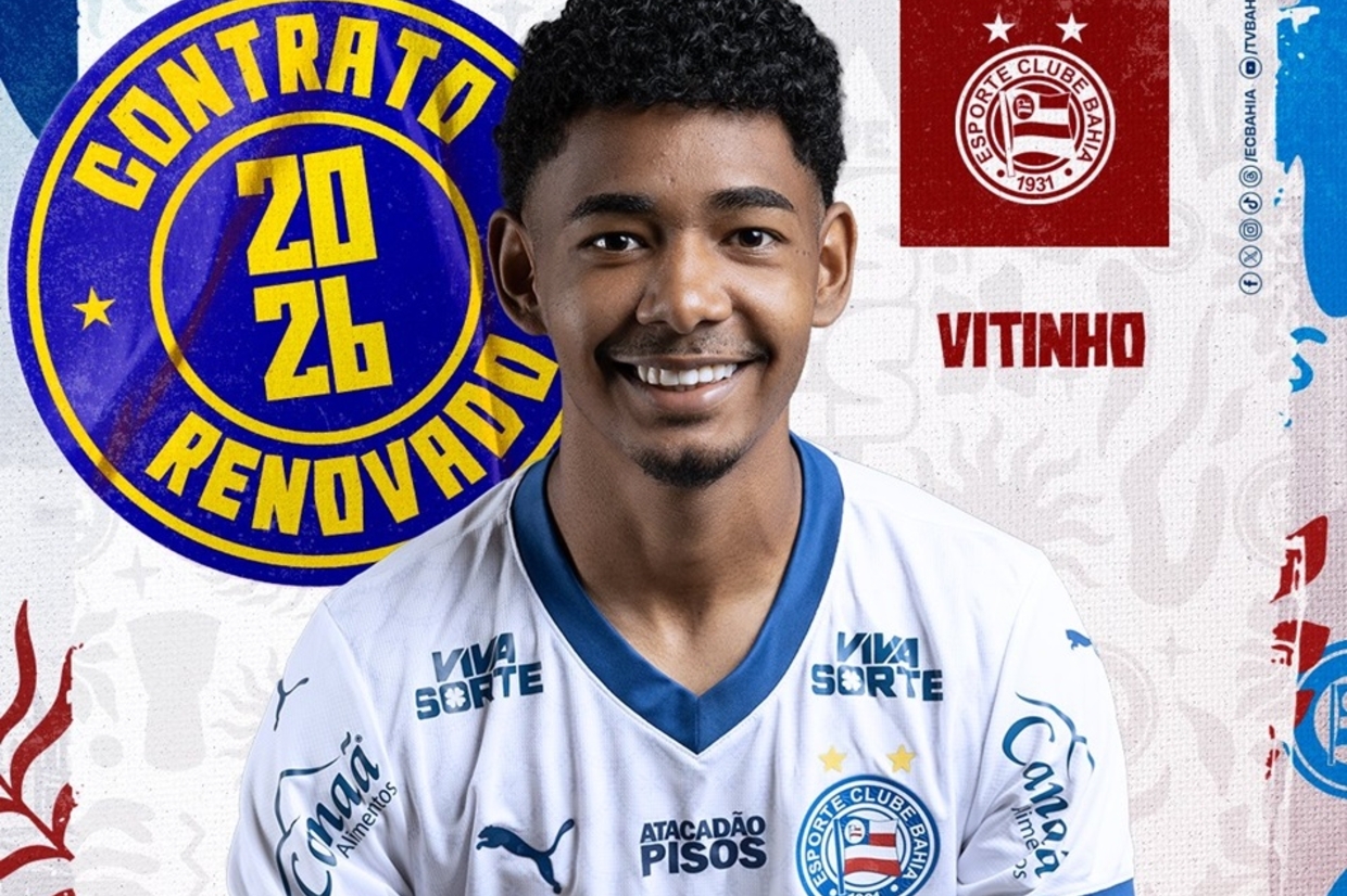 O {TEAM_LINK|2231|Bahia} anunciou na noite desta quinta-feira, 10, que chegou a um acordo para renovação de contrato do meio-campo Vitinho. O jogador, cria da divisão de base do club, tinha vínculo chegando ao fim nos próximos meses e agora assinou até o final de 2026.