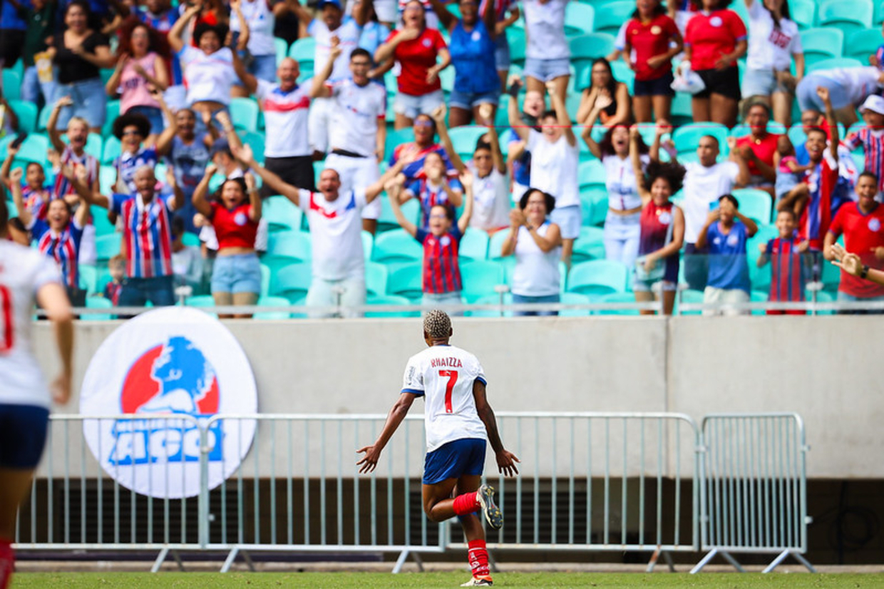 A manhã foi de festa das Mulheres de Aço na Fonte Nova. Com um hat-trick da atacante {PLAYER_LINK|708289|Rhaizza}, o Bahia venceu pela primeira vez na história a Ferroviária, por 3 a 1, pelo Brasileirão Feminino.