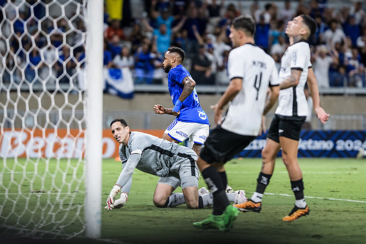 O jogo no Mineirão já começou elétrico e com o Botafogo melhor. No primeiro minuto, Jeffinho puxou contra-ataque e serviu Luiz Henrique, que perdeu disputa na área para o goleiro Anderson. Aos 3, a resposta do Cruzeiro, na finalização de Neris, que Gatito se esticou para espalmar. Já aos 5, com forte marcação alta do Glorioso, Júnior Santos recuperou a bola no ataque, arrancou e serviu Tiquinho Soares, que completou para o gol vazio e abriu o placar.