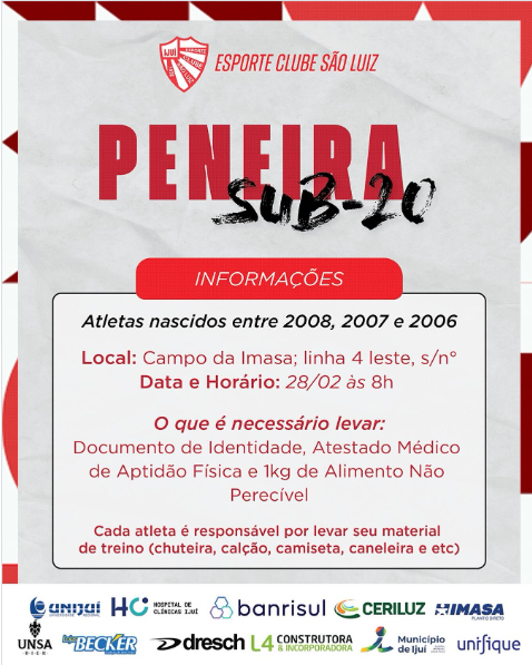 O Sub-20 do Esporte Clube São Luiz está com peneira aberta para atletas nascidos em 2006, 2007 e 2008.