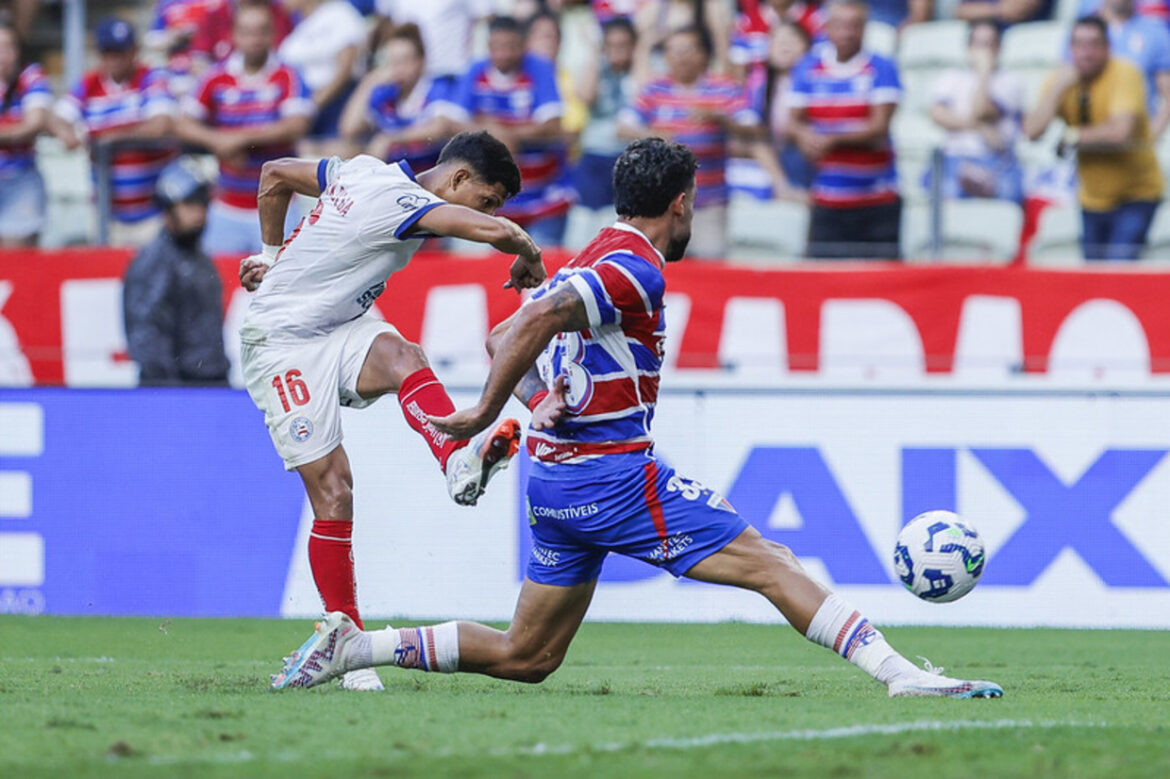 Em duelo tricolor animado no Castelão, o {TEAM_LINK|2239|Fortaleza} saiu na frente com um golaço de Marinho, mas Éverton {PLAYER_LINK|33266|Ribeiro} buscou o empate para o {TEAM_LINK|2231|Bahia} no segundo tempo: 1 a 1.