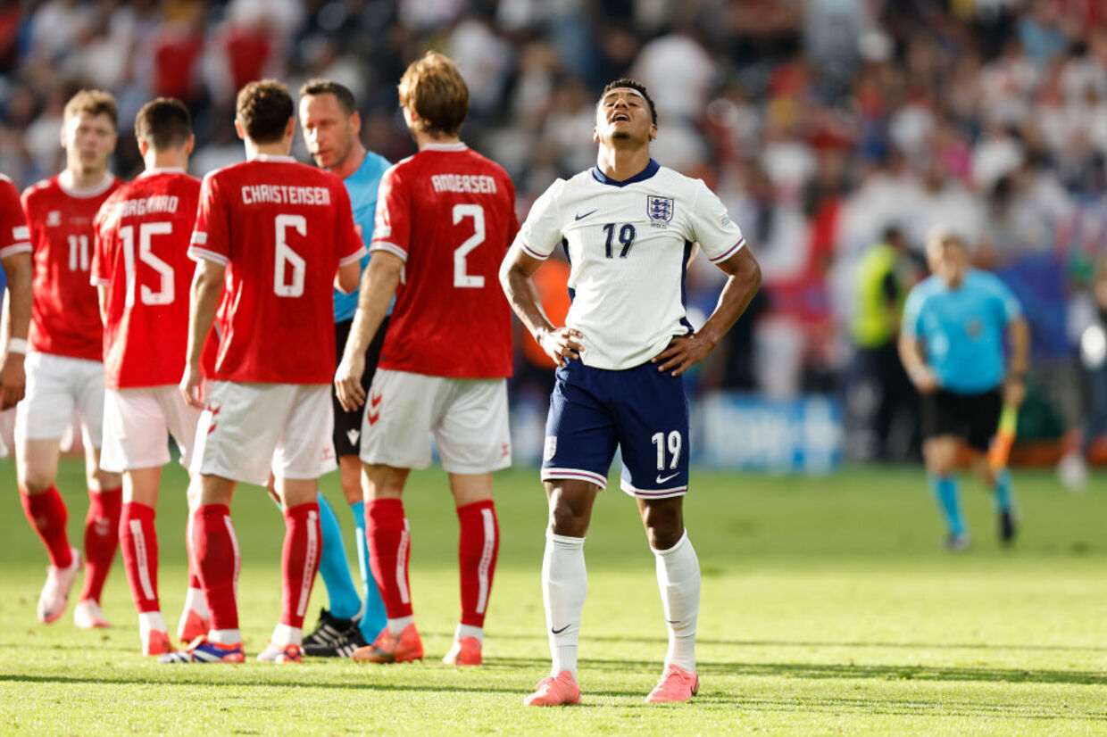 Em Frankfurt, Ingleses e dinamarqueses protagonizaram um primeiro tempo equilibrado, com momentos distintos de domínio para os dois lados. Logo no primeiro minuto, a Dinamarca tentou surpreender o English Team. Com menos de um minuto, Höjbjerg achou espaço de fora da área e arriscou, colocando Pickford para trabalhar pela primeira vez.