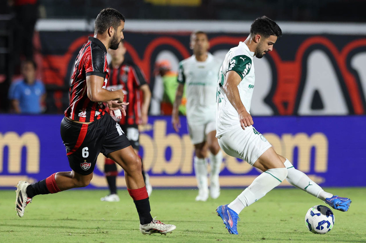 O {TEAM_LINK|2259|Vitória} recebeu o {TEAM_LINK|2248|Palmeiras} reserva no {STADIUM_LINK|278|Barradão} e somava três importantes pontos no {COMPETITION_LINK|51|Brasileirão}, mas não deu. Mesmo com o começo rápido alviverde, o Leão igualou as ações e abriu o placar na primeira etapa. O ritmo rubro-negro seguiu alto para os 45 minutos finais e a vantagem ampliou, mas o rival paulistano rapidamente descontou. O Palestra foi em busca do segundo e, no finalzinho, deixou tudo igual. 2 a 2.
