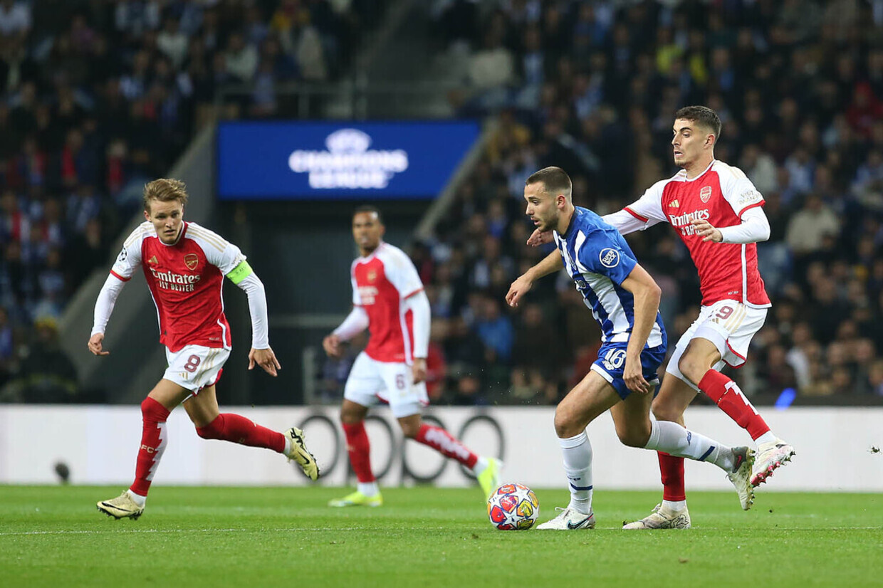 Com marcação em blocos altos, o Porto conseguiu afastar o Arsenal de sua área nos primeiros minutos de jogo. O time de Mikel Arteta trocava passes no campo de defesa, sem conseguir avançar.